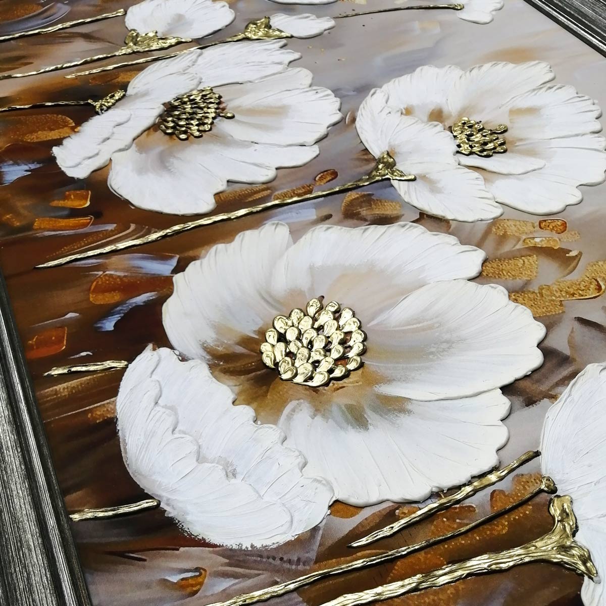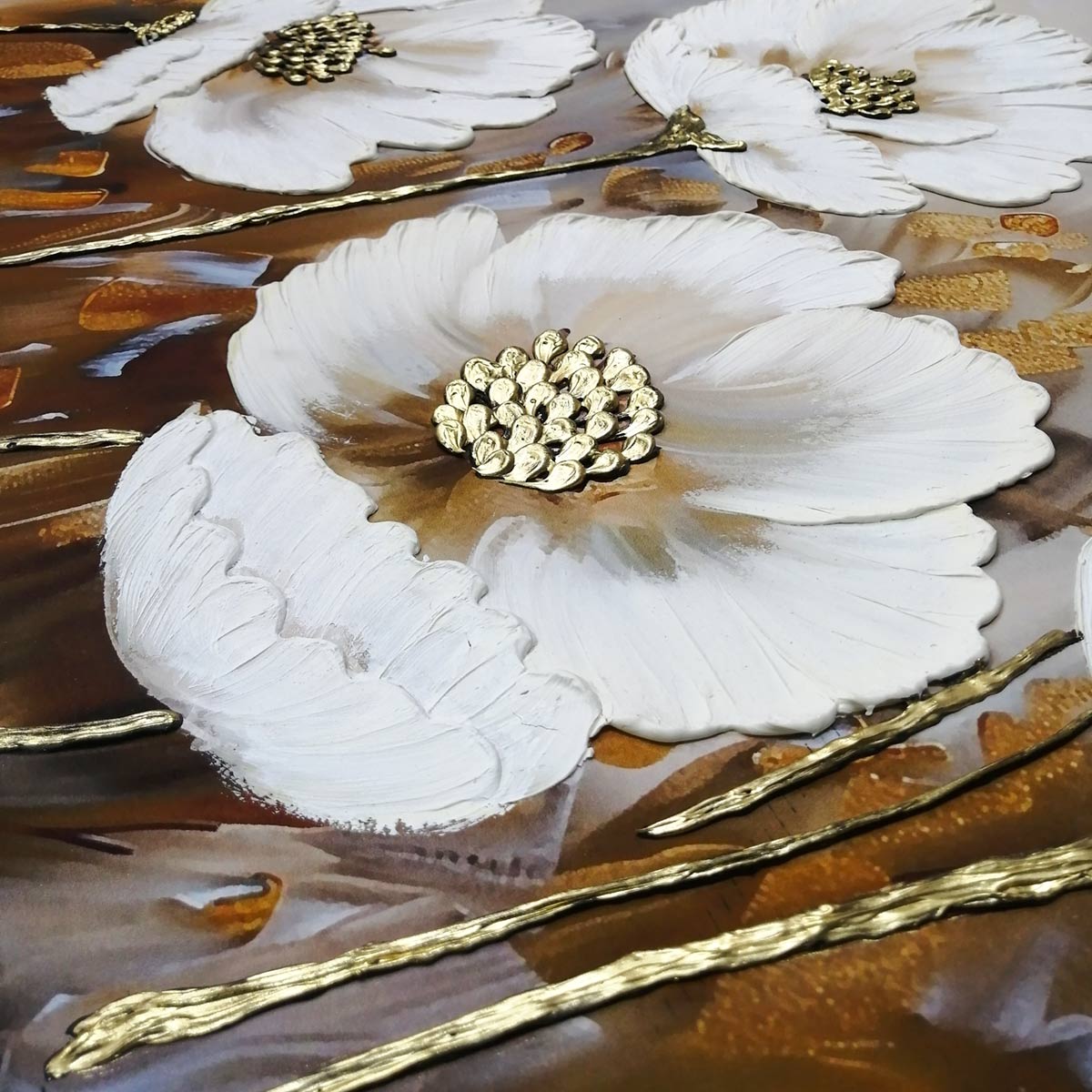 گلها و برگها با حجم واقعی و قابل لمس ساخته میشوند که حس زنده بودن و عمق به دیوار میدهند (نه فقط نقاشی تخت).